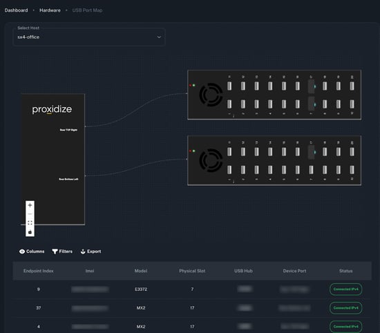 For users with Proxidize hardware (e.g. HX1 USB Hub), a 2D diagram of the host, USB hubs, and connected endpoints is displayed at the top of the page.