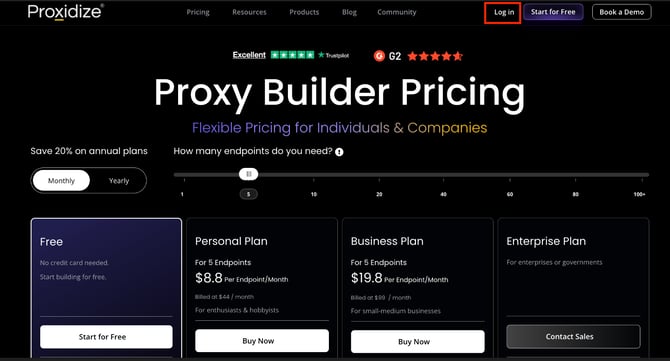To begin, sign in to your Proxidize account from proxidize.com or by navigating directly to app.proxidize.com.