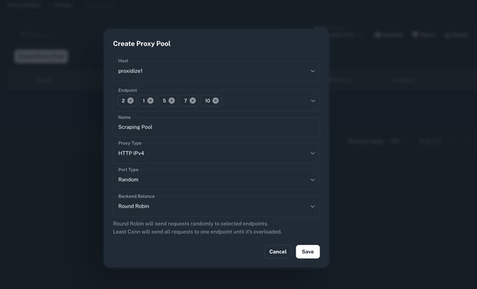 Proxy Pools let you group multiple endpoints under a single proxy address. Instead of connecting to individual proxies, all traffic is routed through the pool and distributed across the selected endpoints automatically. This is useful for increasing throughput and avoiding overloading a single connection.